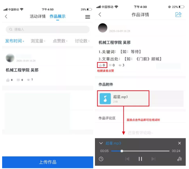 ④ 音频格式:mp3,文件大小不超过 50M(添加附件云盘上传);