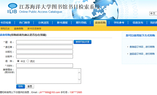 (1)“读者荐购”:详细填写荐购表中的有关栏目,以便采购人员更加准确快速的订购您所需的书籍。