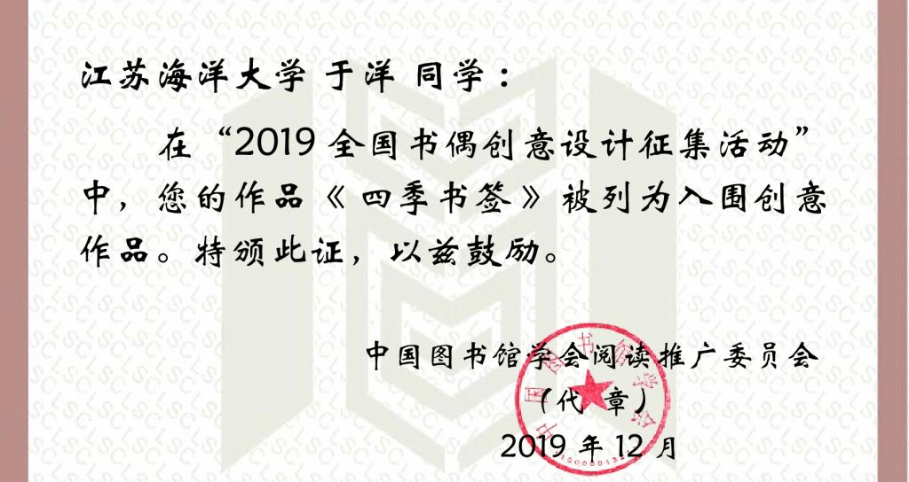 3月18日,从全国书偶创意设计征集活动组委会传来喜讯,我校艺术学院于洋同学的作品《四季书签》在“2019全国书偶创意设计征集活动”中获“2019全国书偶创意设计征集活动最佳创意设计作品”称号。