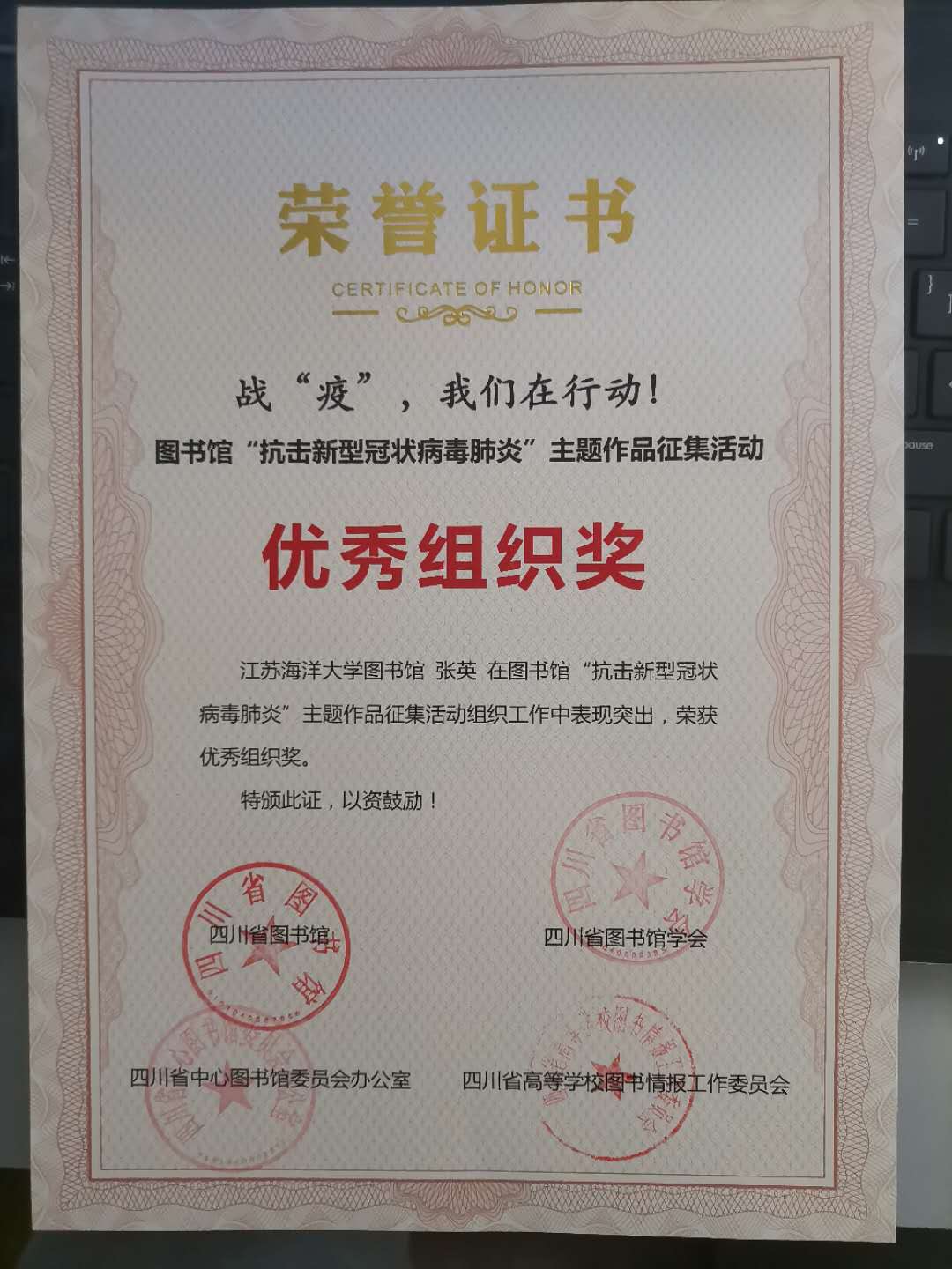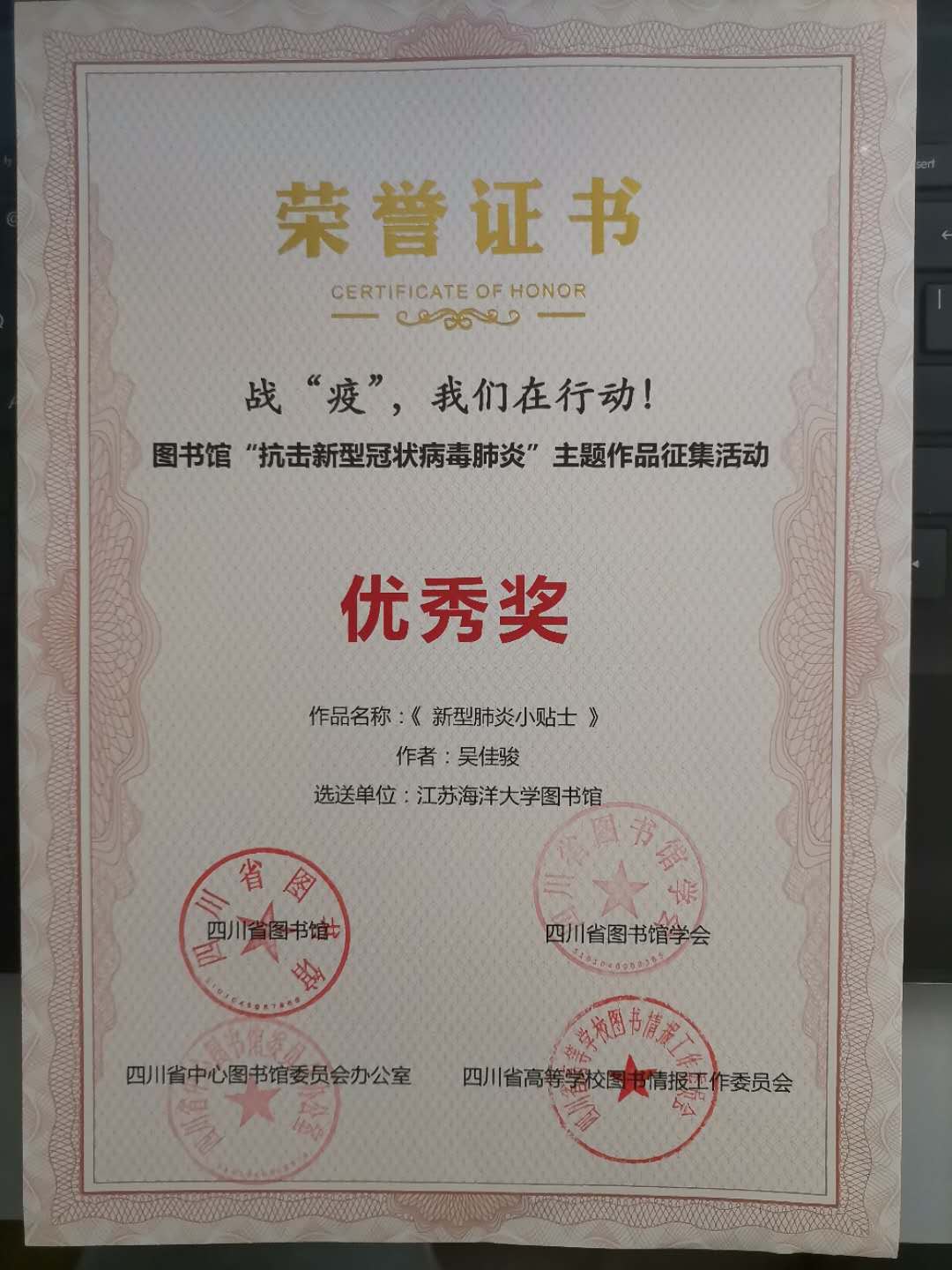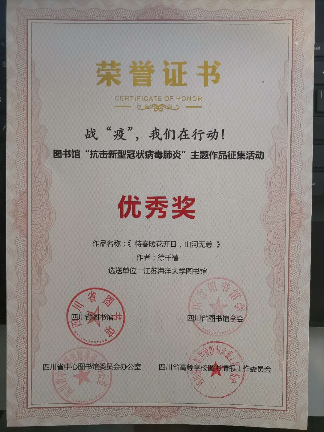 我校图书馆山海阁积极组织校内同学参赛,通过线上参赛群积极筹备,共收到来自胡玉磊、何煜文、贾紫硕、李潇曼、廖雪茗等60位同学的76个不同题材作品投稿。经过大赛组委会的初审复审两轮专家评审,16位同学进入大赛最终总评审。最终,龙正茂同学的海报作品《逆行者》、徐芊禧同学的散文作品《待春暖花开日,山河无恙》、吴佳俊同学的视频作品《新型冠状病毒肺炎小贴士》获得优秀奖。同时,我校图书馆荣获四川省外唯一一个“优秀组织奖”获奖单位,图书馆张英、姚宁两位老师获得大赛优秀组织个人奖。