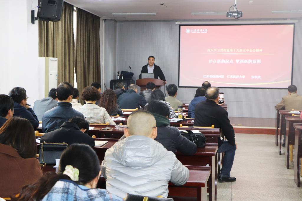 为进一步引导图书馆职工深入学习贯彻党的十九届五中全会精神,11月11日下午,图书馆党总支邀请江苏省委讲师团成员,江苏海洋大学马克思主义学院党总支书记张学武做了题为《站在新的起点 擘画新的蓝图》的专题报告,会议由图书馆党总支书记王恒民主持,图书馆全体职工、机关党委第十二党支部参加了专题报告会。