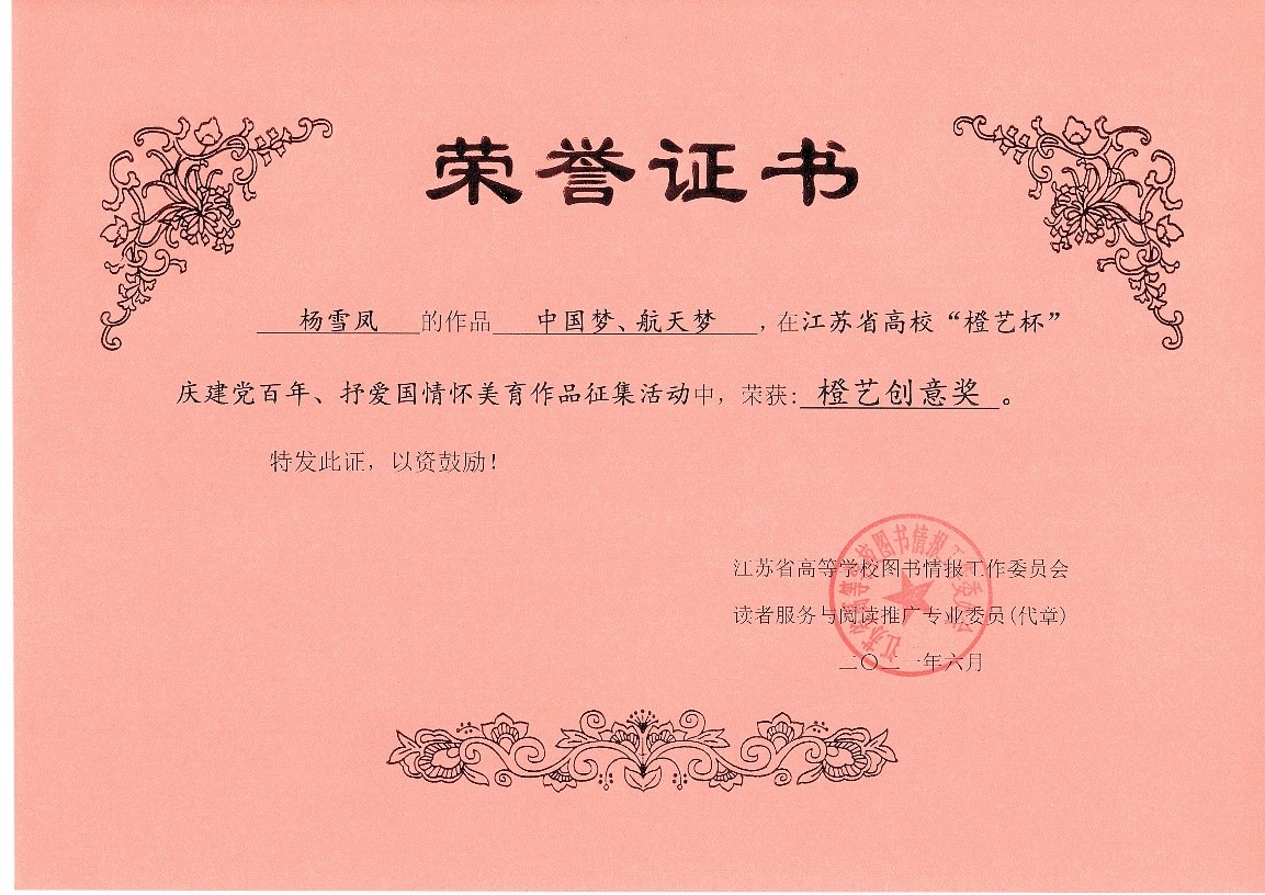 近日,从江苏省图书情报工作委员会传来喜讯,我校艺术设计学院18级学生杨雪凤参赛作品《中国梦、航天梦》,成功晋级江苏省总评,从全省3000多件参赛作品中脱颖而出,荣获大赛橙艺创意奖。我校图书馆获得大赛优秀组织奖。