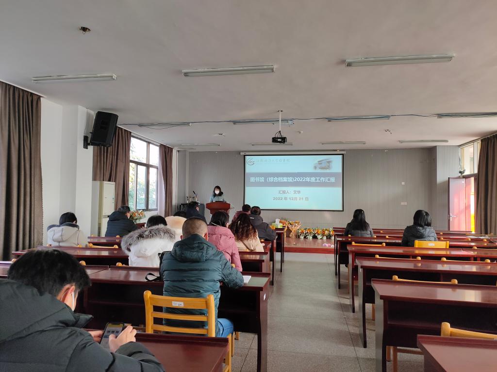 会议在庄严的国歌声中拉开序幕。会上,图书馆党总支书记艾华首先作了《图书馆(综合档案馆)2022年度工作汇报》,她从党建引领相融合、中心大局抓落实、以巡促改强建设、筑牢防线强作风、工会作用聚合力、党政协同增成效等七个方面总结了图书馆2022年各项工作取得的成绩,分析了存在的问题,提出了加强学习调研、创新服务模式、加大专业人才队伍引进等努力方向,对图书馆在统筹做好疫情防控、校第四届读书节活动的圆满完成,校广播操比赛获得一等奖、2022年“优秀职工之家”“优秀学术团队”“榜样馆员”等方面获得的优异成绩表示了肯定,这些成绩展示了图书馆人的良好形象和坚强合力。接下来她作了《图书馆2022年度财务预算执行情况报告》,对一年来图书馆各项经费的使用情况作了汇报。图书馆副馆长、分工会主席胡昌芹作了《图书馆分工会2022年工作报告》。会议表决审议并通过了以上三个报告。