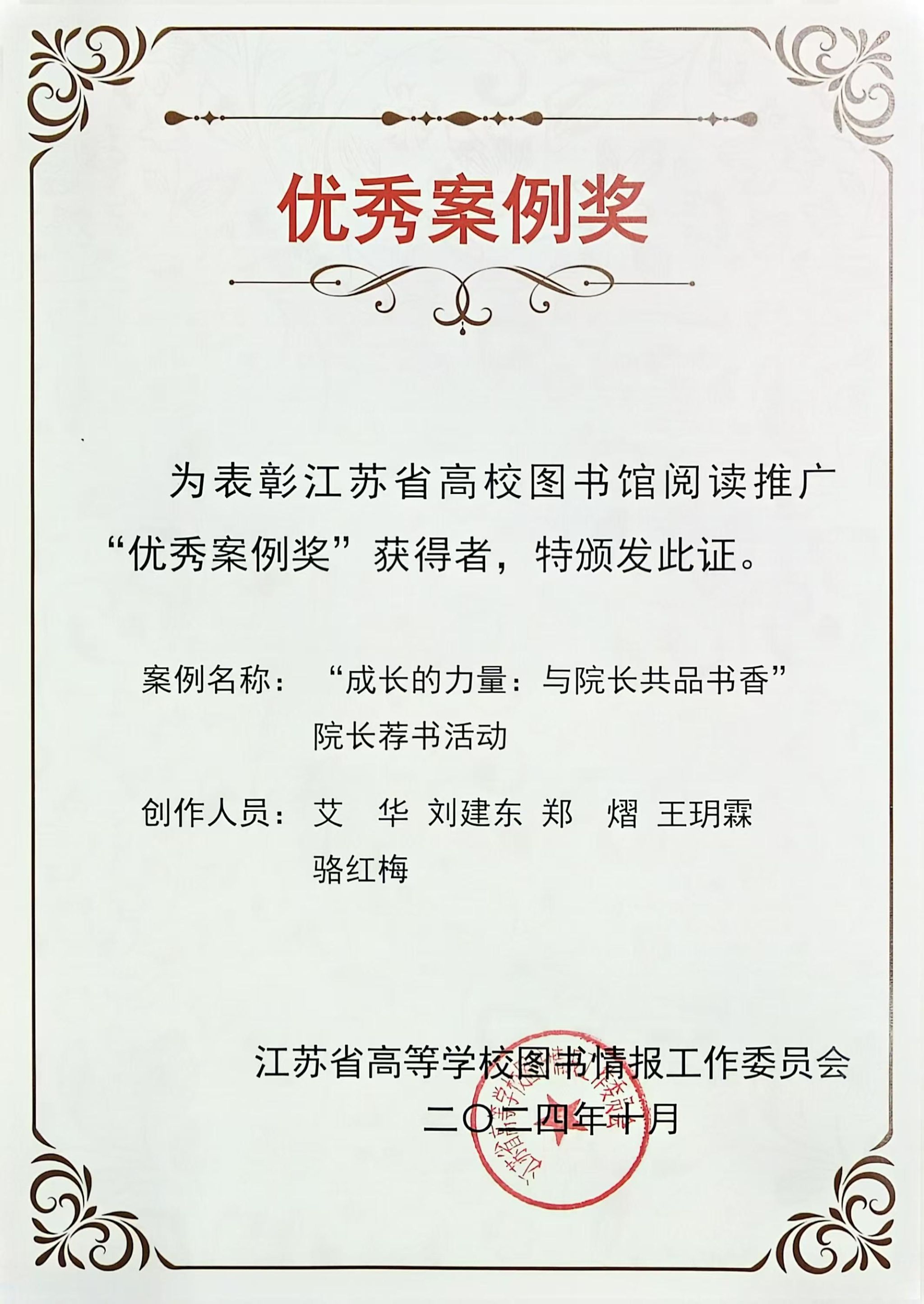 10月16日,我校图书馆报送的案例“成长的力量:与院长共品书香”院长荐书活动,荣获江苏省高等学校图书情报工作委员会评选的2024年江苏省高校图书馆阅读推广“优秀案例奖”。