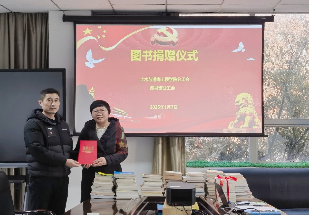 2025 年 1 月 7 日下午,一场意义深远的图书捐赠仪式,在图书馆二楼会议室温情启幕。土木与港海工程学院怀着对知识传承的热忱,向校图书馆慷慨捐赠了230册价值不菲的图书。学院党委副书记魏学庆、学生党支部书记及师生代表、图书馆副馆长胡昌芹及相关负责同志齐聚一堂,共同见证这一知识接力的重要时刻。