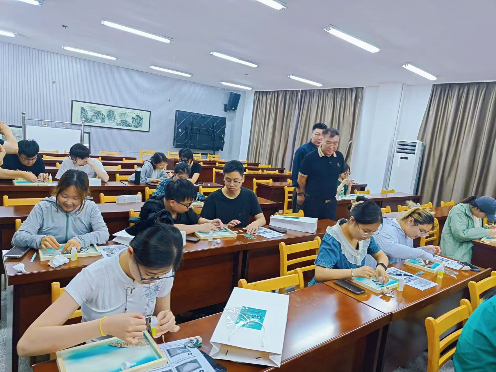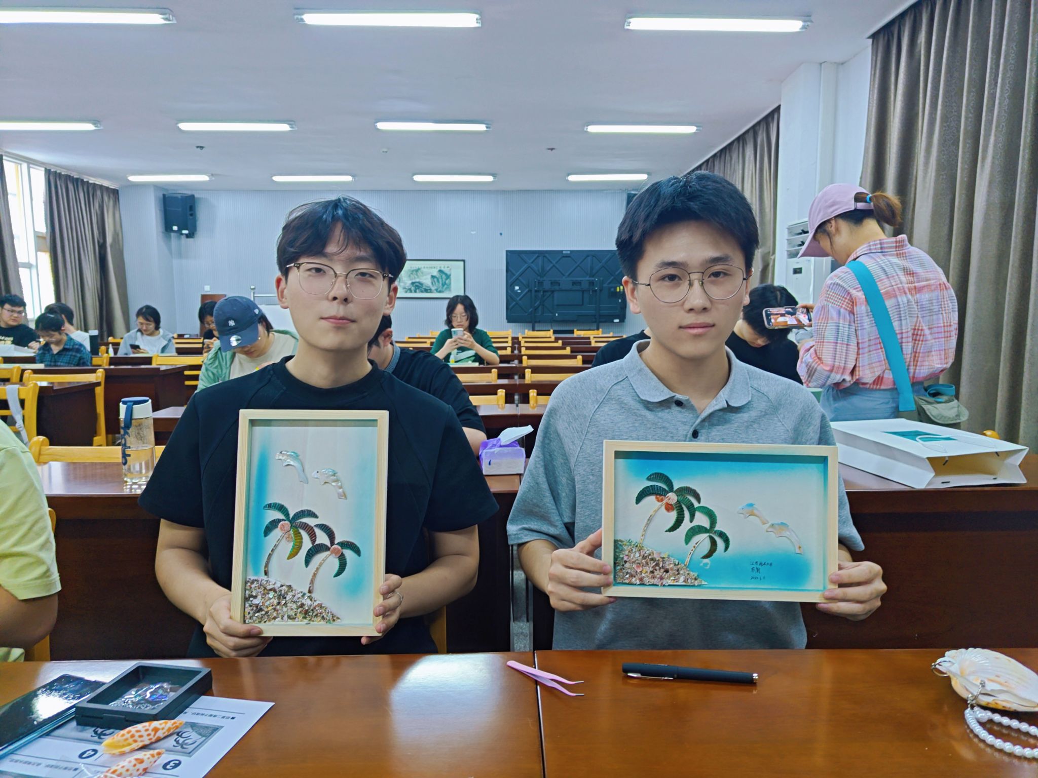 活动现场,陈建国老师及其助手分别讲授了贝壳的种类、特点和形成过程;深入浅出介绍了贝雕的历史渊源、制作技艺和文化内涵。还展示了部分有代表性的精美贝雕作品,现场学生通过近距离观摩贝雕画作,深刻感受到海洋文化遗产传统工艺“化平凡为神奇”的魅力。实践环节中,图书馆为同学们提供了20套免费专属贝雕材料包和工具,在老师的指导下,学生亲手制作贝雕作品,设计造型,在拼贴中感受传统工艺的精妙。两位同学的作品将收藏在连云港老街的贝雕博物馆里。