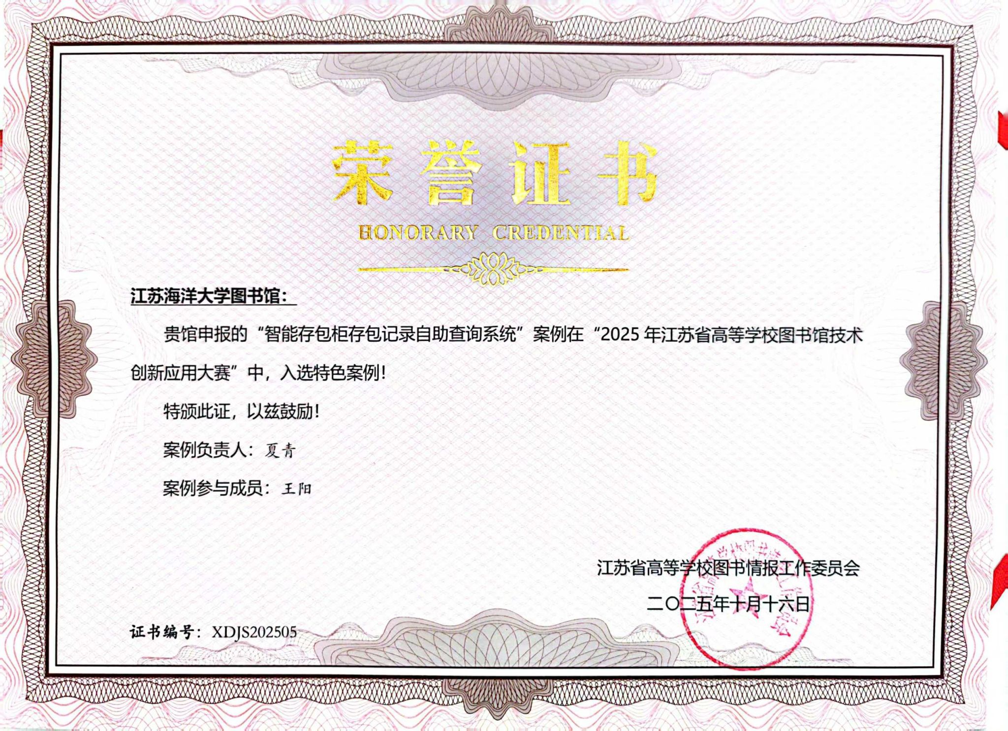 其后,在10月15至17日于南京召开的江苏省高校图书情报工作委员会现代技术专业委员会 2025 年年会上,再传捷报,我校图书馆申报的“智能存包柜存包记录自助查询系统”案例成功入选特色案例。案例负责人为夏青,王阳参与完成。随着校园一卡通的应用场景不断拓展,图书馆智能联网型存包柜已全面取代传统人工管理设备,为读者提供了便捷的私人物品保管服务,但也出现了读者误操作导致物品查找困难的问题。针对这一痛点,该案例研发了专属解决方案:基于 VB6.0 开发软件并搭载读卡器。该系统投入使用后,大幅提升了问题解决效率,赢得了读者与馆内工作人员的一致好评。