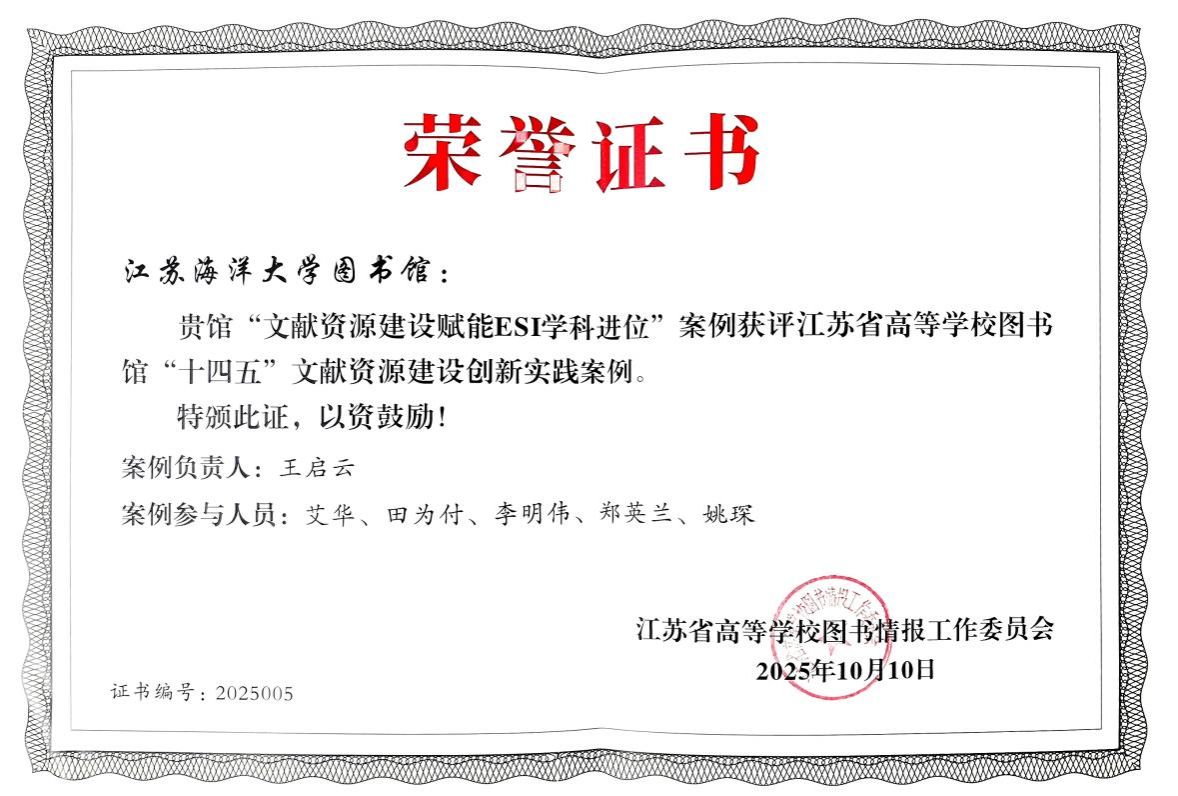 10月10日至12日,“构建现代化高等学校图书馆文献资源建设体系”研讨会暨江苏省高校图书情报工作委员会文献资源建设专业委员会2025年年会在无锡顺利召开。会议公布并颁发了“十四五”文献资源建设创新实践案例奖项,我校图书馆申报的“文献资源建设赋能ESI学科进位”案例成功荣获该奖项。该案例由王启云担任负责人,艾华、田为付、李明伟、郑英兰、姚琛共同参与完成。面对ESI评价体系日益成为高校学科实力重要衡量标准的背景,我校图书馆主动转型,将文献资源建设与学校ESI学科发展及博士点创建目标紧密结合。通过探索“资源精准配置、数据驱动决策、开放共享赋能”的创新路径,显著提升了学校ESI全球排名前1%表现,为教学科研和人才培养筑牢支撑。