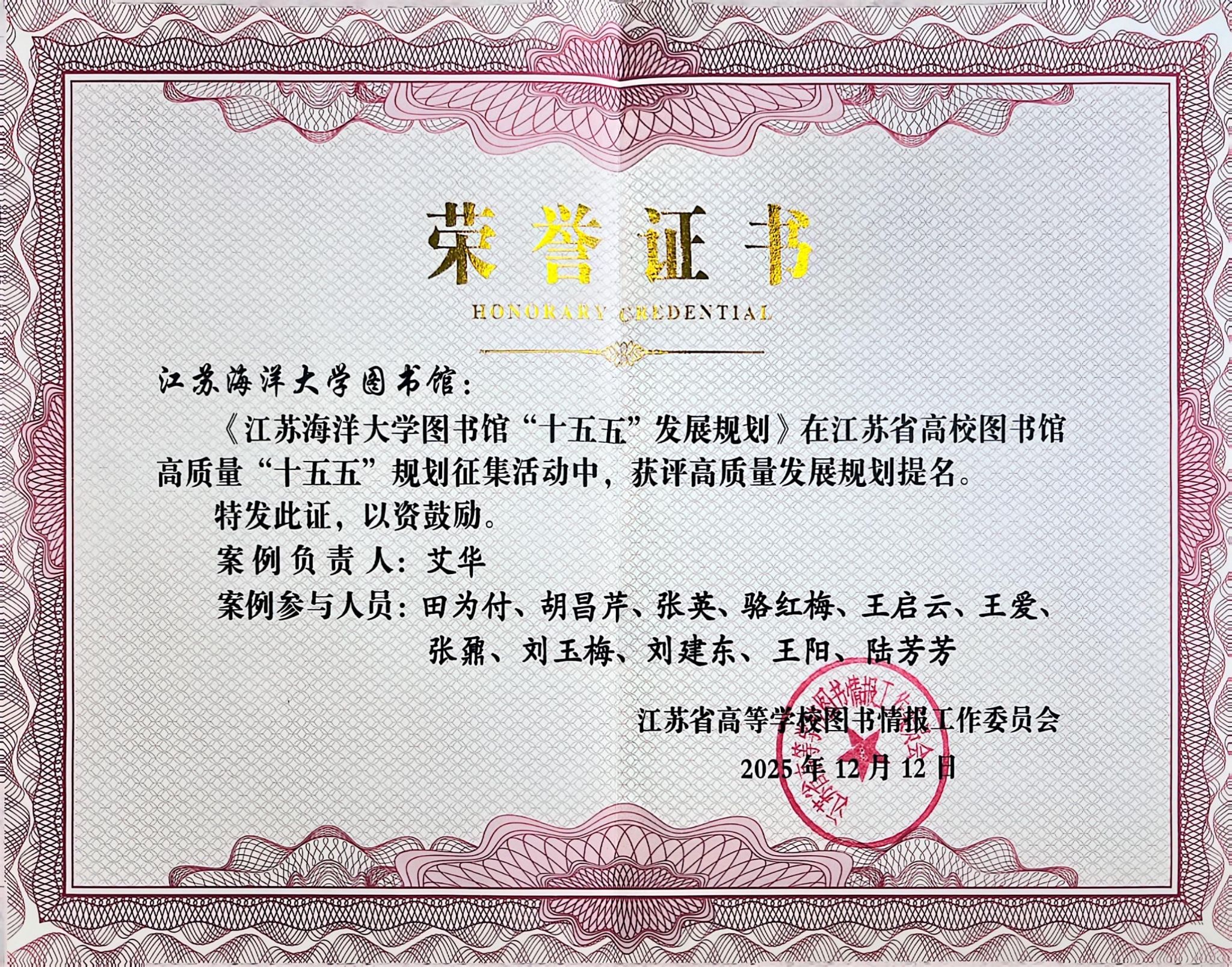 12月12日,由江苏省高校图书情报工作委员会和江苏省高校图书情报工作委员会战略规划与空间建设专业委员会主办、江苏大学图书馆承办的“江苏省高校图书馆‘十五五’规划交流会暨2025年江苏高校图书馆馆长工作会议”在镇江召开。会议聚焦图书馆发展前沿,构建高层次交流平台,谋划图书馆“十五五”发展路径,研究科学决策。吸引了来自全省90余所高校图书馆馆长及代表近200人参会。会议期间举行了“江苏省图书馆高质量‘十五五’发展规划”颁奖仪式,11家单位分获高质量发展规划及提名。我馆提交的《江苏海洋大学图书馆“十五五”发展规划》获评高质量发展规划提名,案例负责人为艾华,案例参与人员包括田为付、胡昌芹等。