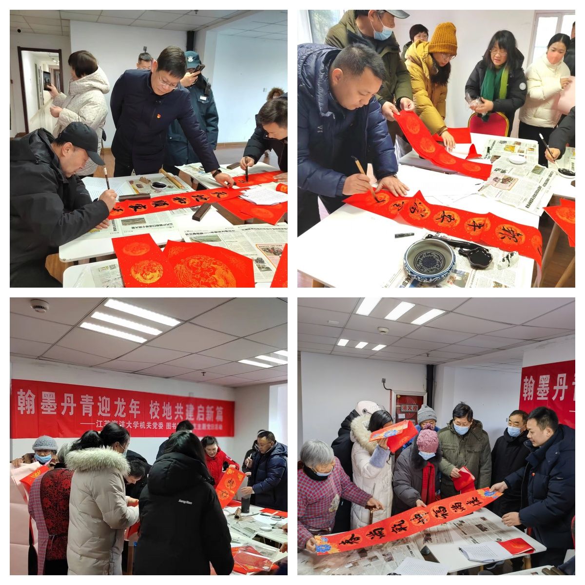 岁回律转,新春将至。为进一步弘扬中华优秀传统文化,增进与地方群众的沟通交流,从而营造欢乐祥和的节日氛围,1月23日上午,机关党委、图书馆党总支走进秀逸苏杭东苑小区,与花果山街道屏竹社区党总支联合开展“翰墨丹青迎龙年 校地共建启新篇”主题党日活动。活动邀请校团委王衍、高等教育研究所孙同福、电子工程学院乔国磊、通灌校区管委会邵营泽、药学院李炜洲等五位老师为小区居民免费书写春联送“福”字。机关党委、图书馆及屏竹社区的领导和有关同志参加了活动。